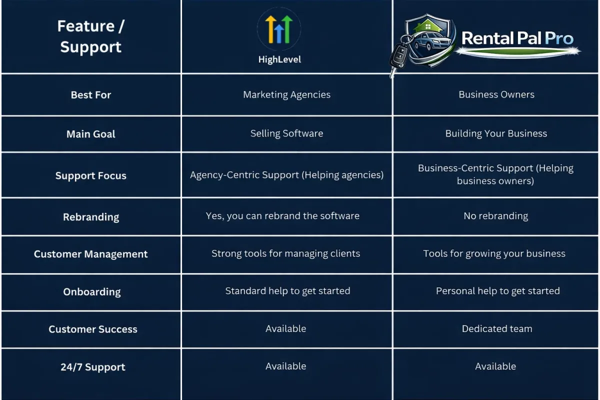 A: HighLevel is generally a better fit for agencies, marketers, and users who want to build and manage systems for multiple businesses or clients. Rental Pal Pro is the better fit for car rental business owners who want a more practical, ready-to-use system built around running and growing a rental operation.